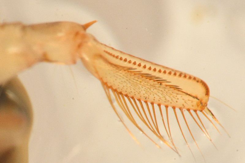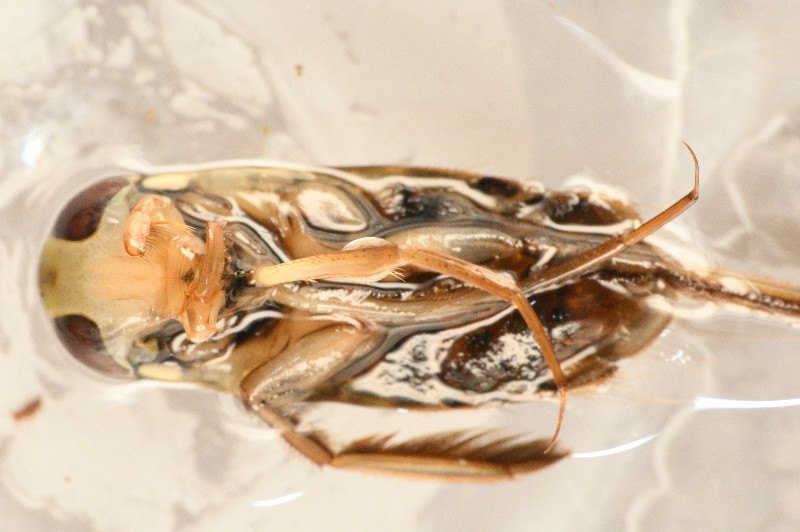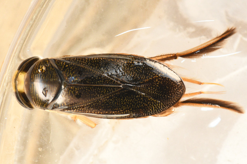 12.5 mm, griffes des pattes intermédiaires plus courte que le tarse, taches pâles des hémélytres non confluentes, disque du pronotum avec environ 15 lignes transverses, palette avec 29 dents stridulantes. D'après Poisson https://faunedefrance.org/bibliotheque/docs/R.POISSON(FdeFr61)Heteropteres_aquatiques.pdf